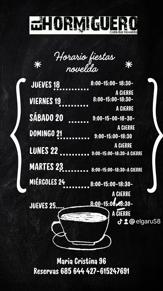 Welcome to Cafe- Bar El Hormiguero in Novelda, an inviting cafeteria nestled on Carrer Maria Cristina. This charming spot boasts a menu that combines traditional Spanish flavors with a modern twist, making it a delightful destination for food lovers.